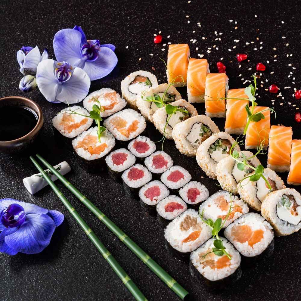 Il sushi è un piatto molto raffinato, tipico della cucina giapponese a base di riso insieme ad altri ingredienti come pesce, alghe, vegetali o uova. Il ripieno può essere crudo, cotto o marinato e può essere servito appoggiato sul riso, arrotolato in una striscia di alga, disposto in rotoli di riso o inserito in una piccola tasca di tofu.