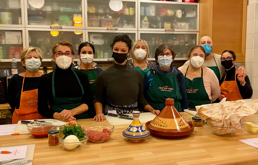 In questa lezione la nostra Anahita ci ha fatto scoprire l’utilizzo della Tajine; questo termine indica sia la pentola che la pietanza che grazie ad essa si prepara. Originariamente, la cottura avveniva appoggiando la tajine sulle braci, mentre oggi i piatti hanno un fondo di metallo, così che si possano porre sui fornelli a gas di casa. La cottura è a fuoco lento, in questo modo le verdure si insaporiscono e la carne diventa molto tenera e profumata. La differenza rispetto ad altre pentole è che la forma conica fa sì che i vapori si condensino e ricadano sui cibi che stanno cuocendo, mantenendo così all’interno della Tajine gli aromi che di solito vanno persi e rendendo il gusto dei piatti ancora più intenso. La cottura così non prevede chissà quali condimenti e può essere anche definita light, perché è quasi al vapore. L’utilizzo di spezie fa il resto. La parte inferiore viene usata per servire il piatto in tavola.