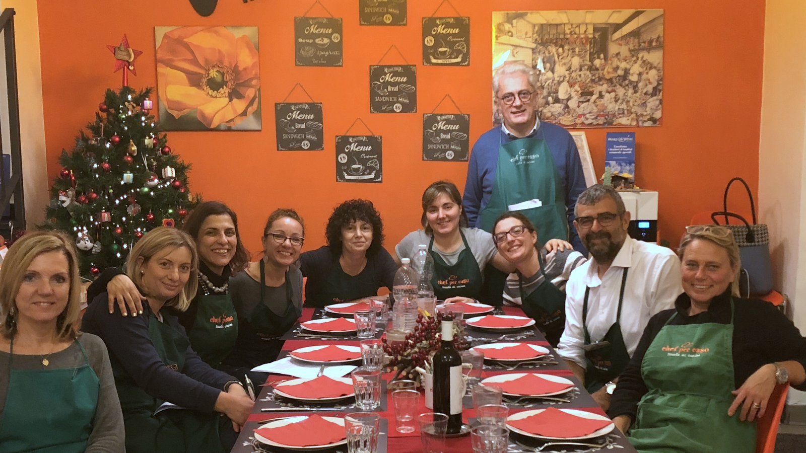 Replica serale del menù di Natale per Claudia, Valeria, Marta, Michela, Enza, Sonia, Pietro, Michela, Gianluca e Francesca che si sono divertiti a prepararlo in un clima sereno e rilassato…alla fine in alto i calici e buon Natale a tutti!